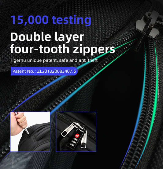 We are the first manufacturer mentioned the anti theft concept for laptop backpacks in China. The double layers zipper is one of our greatest invention, which was created in 2013. It’s stronger than the common zipper with only one layer.