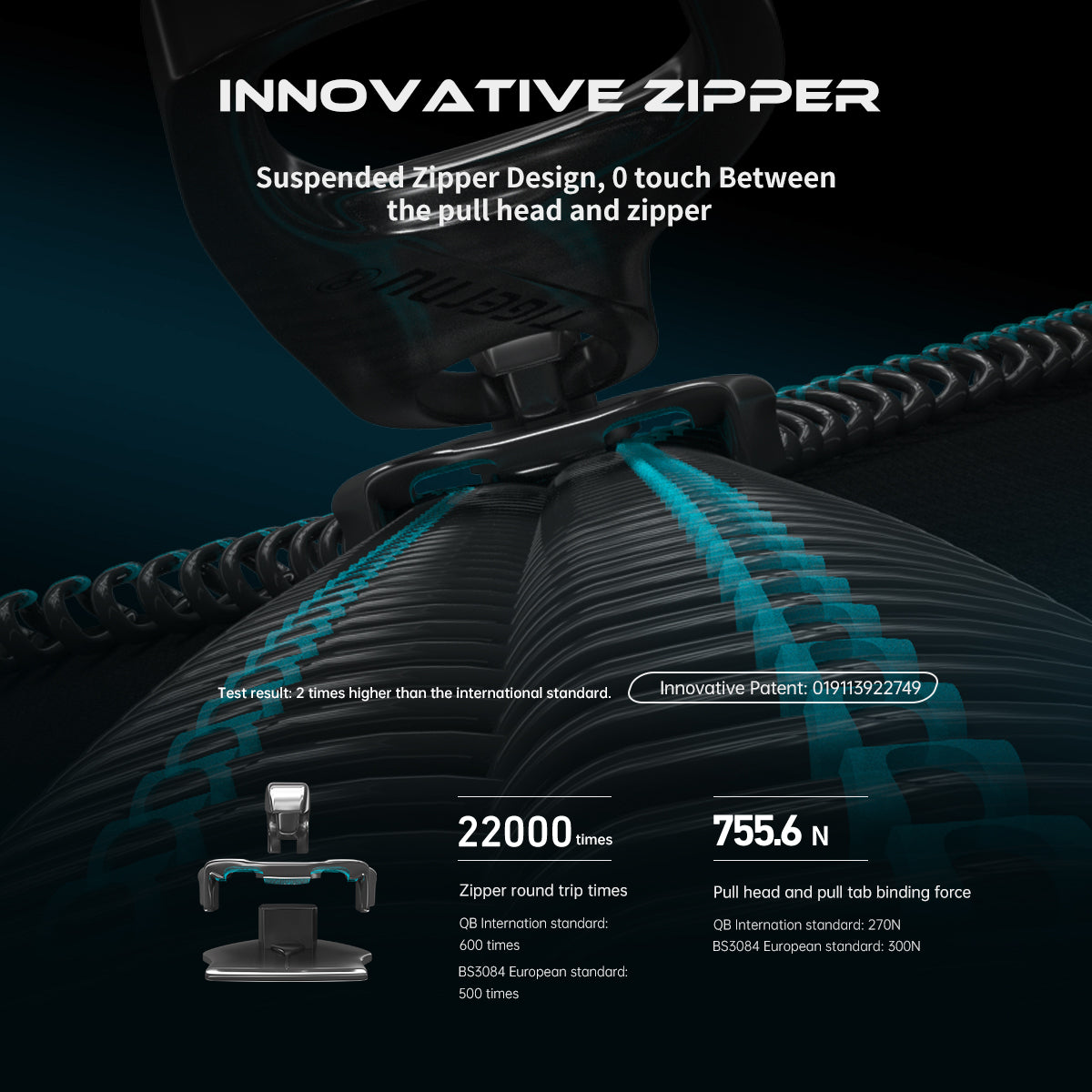 1. Brand patent innovative zipper, Suspended design zipper, reduce friction, longer life time