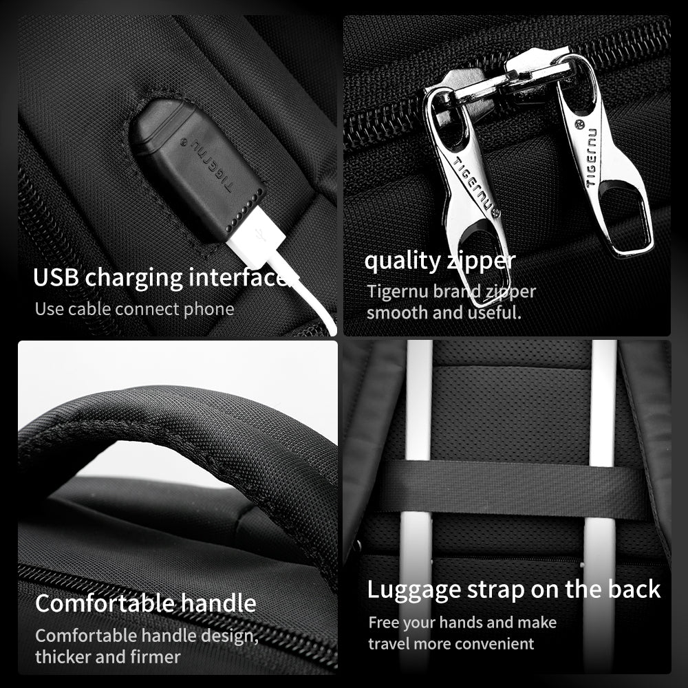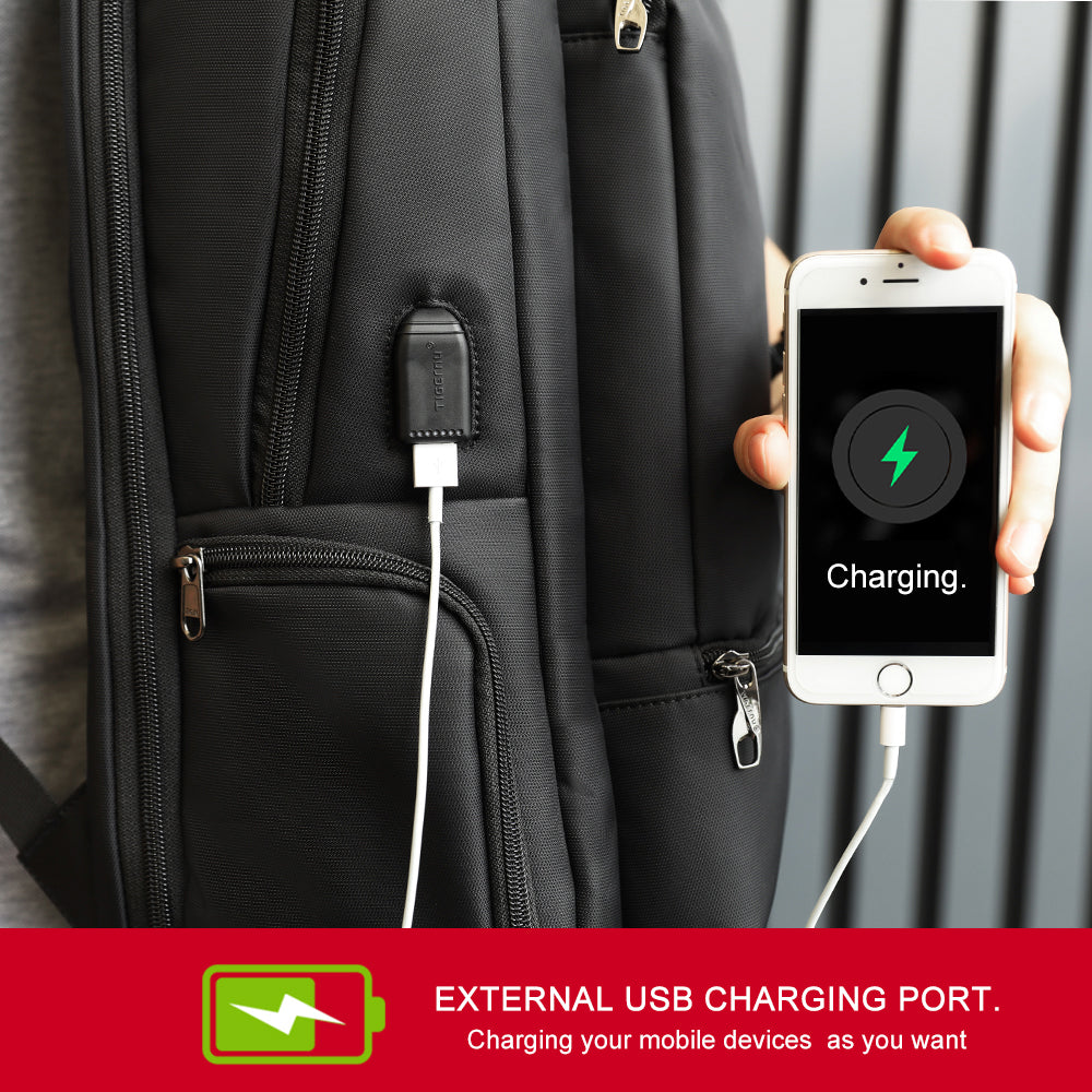 - Features:External USB port with built in detachable USB cable design make this USB backpack easy to charge your cellphone anywhere without taking out your power bank.Padded shoulder strap is adjustable and feel more soft on the shoulder even when fully loaded. A well-knit luggage belt is fixed for the laptop bag on the trolley of your luggage, making your journey and travelling more convenient.